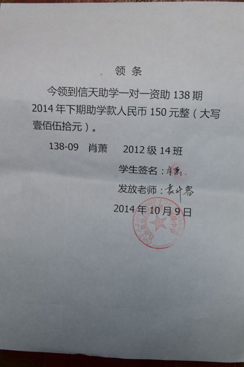 第138批马边第一初中(2014年3月-2014年7月)信天助学款发放签收单