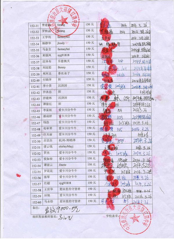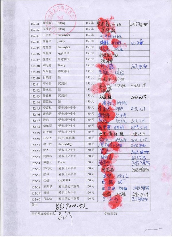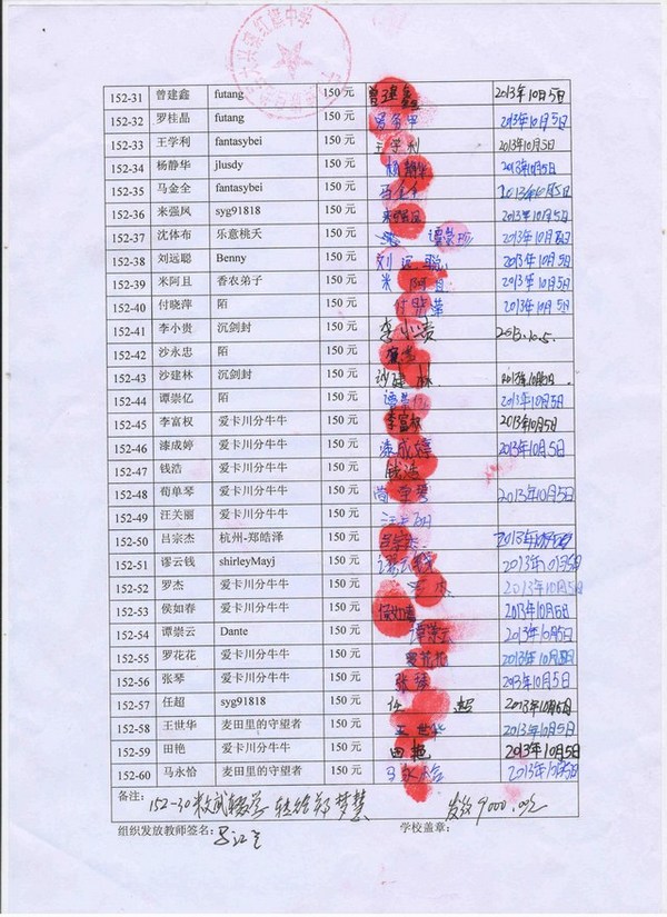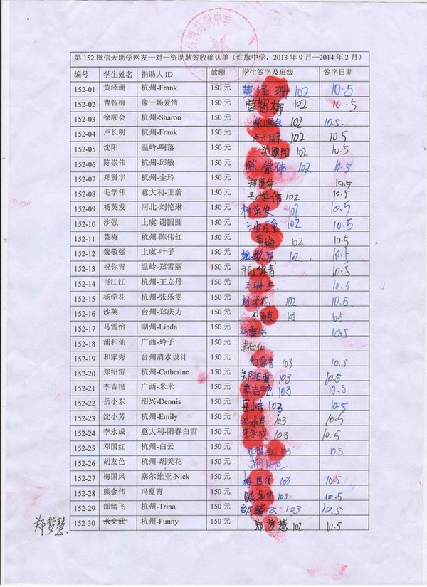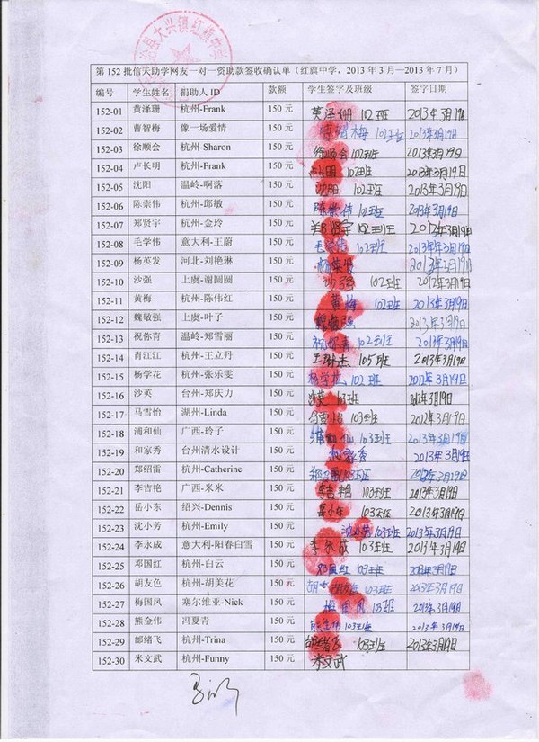 红旗中学152批(2013年3月到2013年7月)受助学生签收单