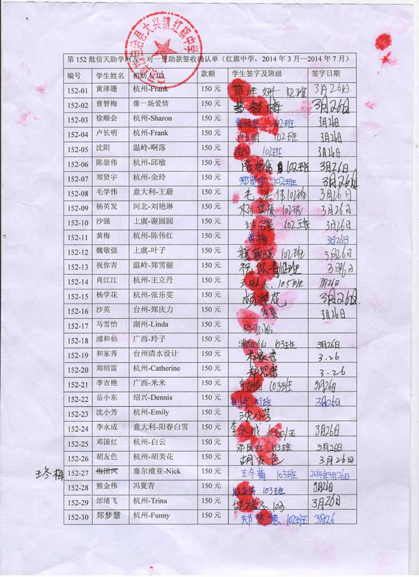 第152批红旗中学(2014年3月-2014年7月)受助学生签收确认单