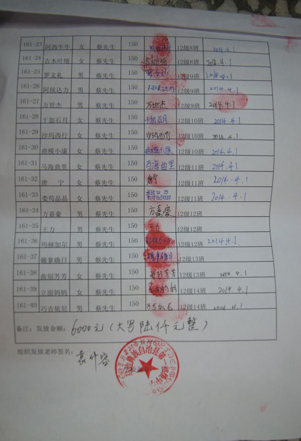 第161批马边第一初中(2014年3月-2014年7月)信天助学款发放签收单