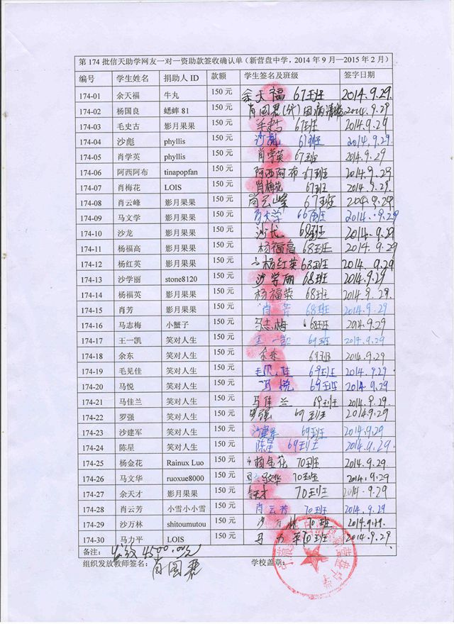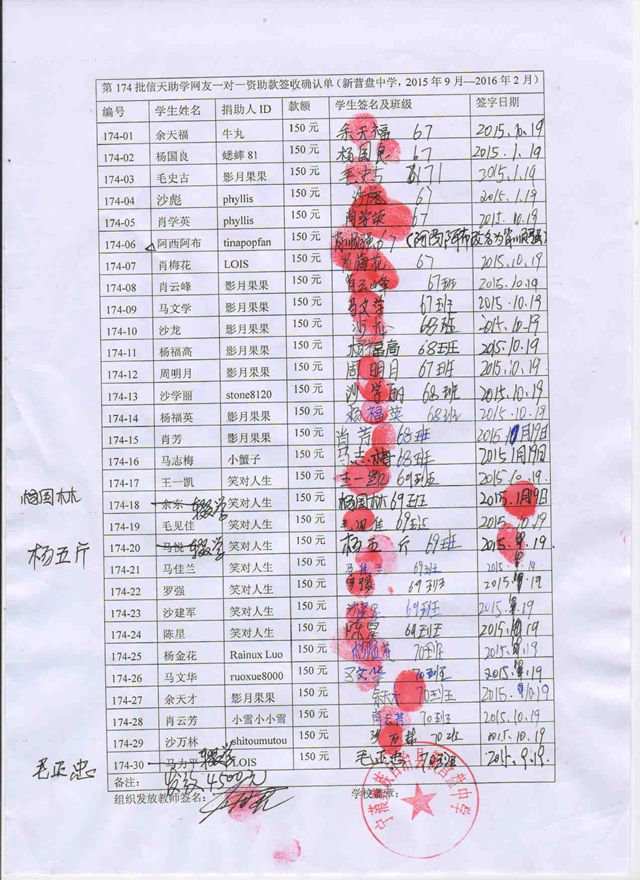 第174批新营盘中学(2015年3月--2015年8月)受助生签收确认单: