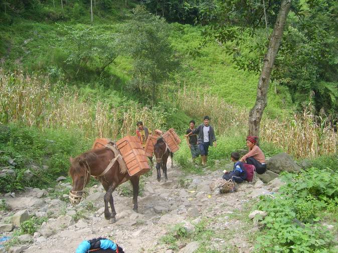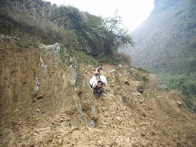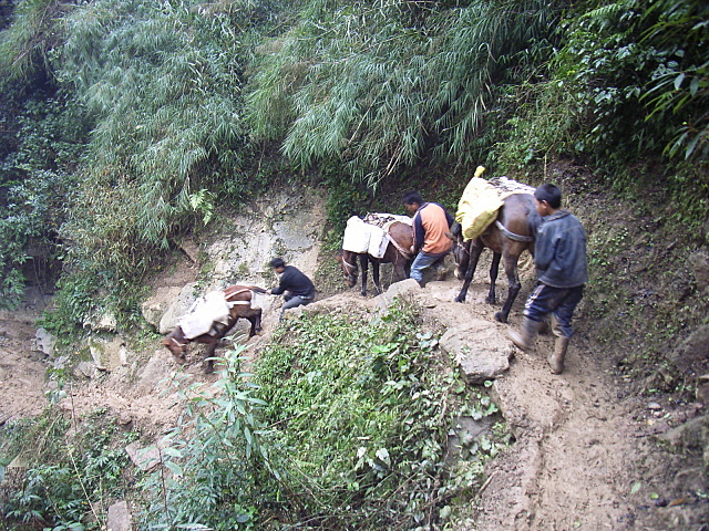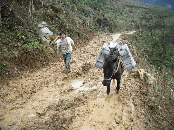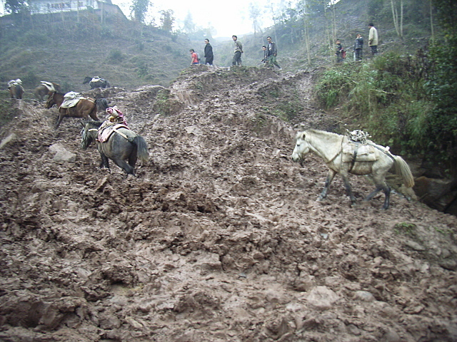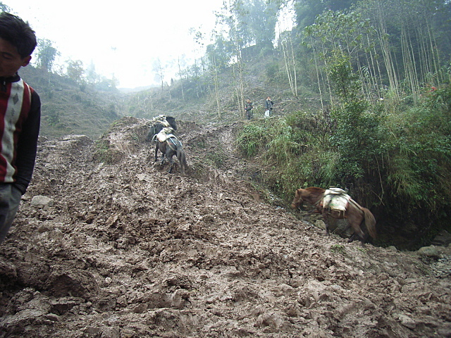 马帮在泥泞的路上托运建材。