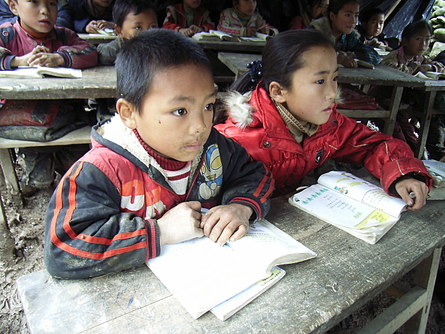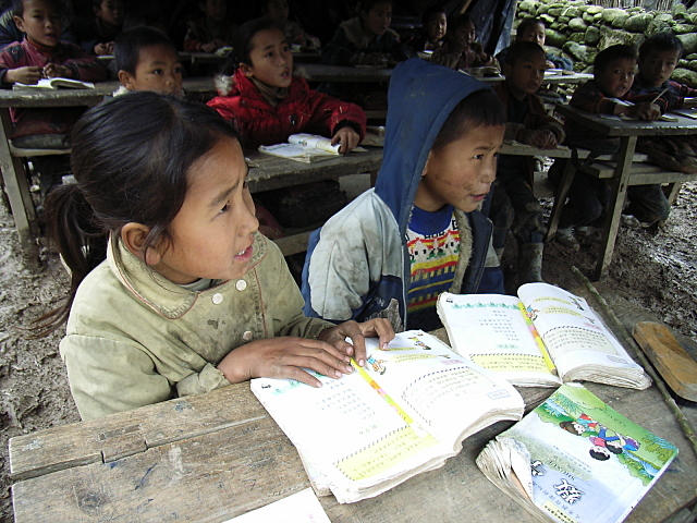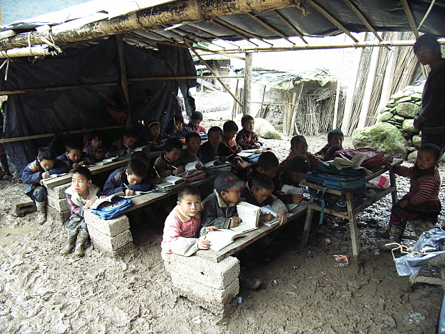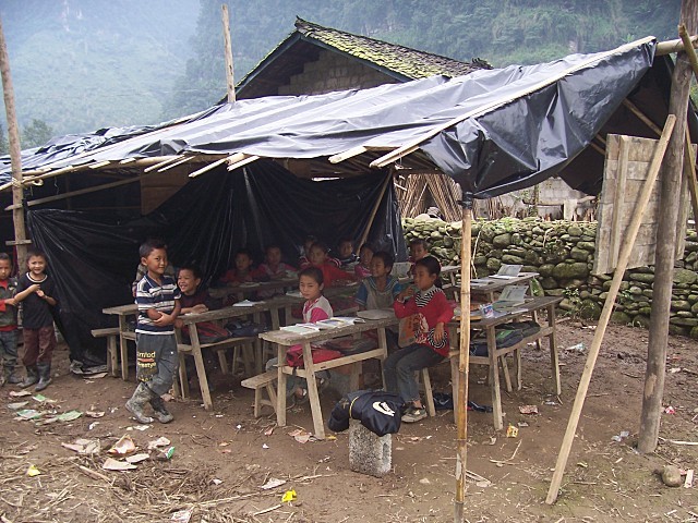 新学校施工中,工地搭起了临时教室,学生临时上课。
