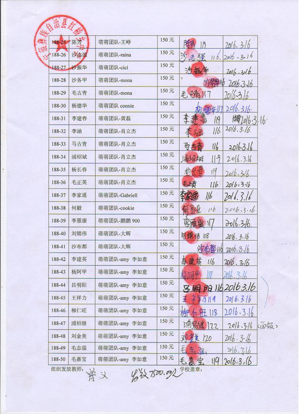 第188批红桥中学(2016年3月到2016年7月)受助学生签收单: