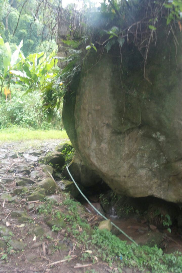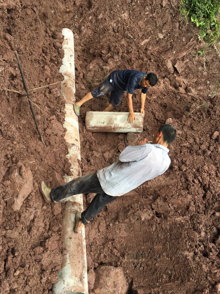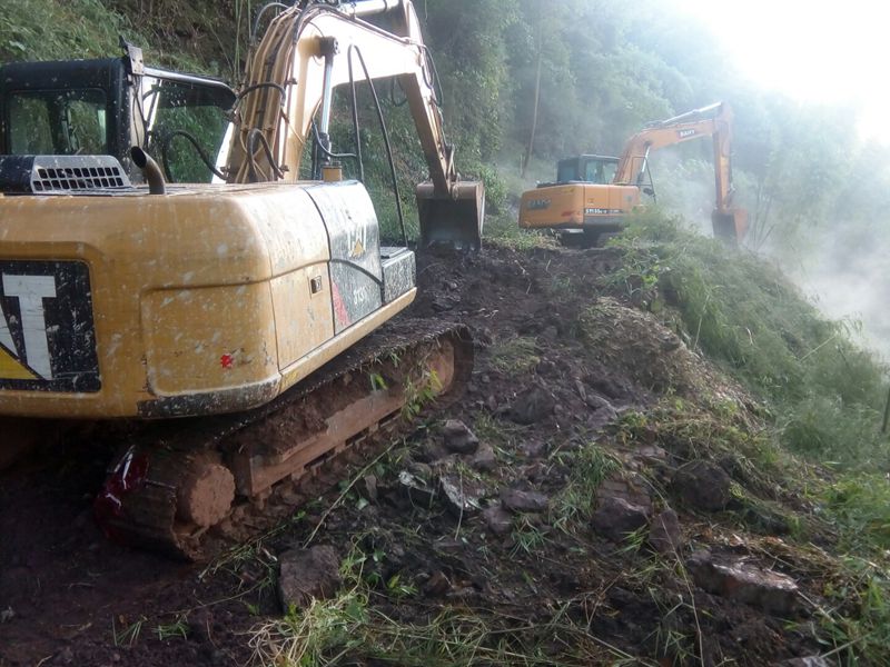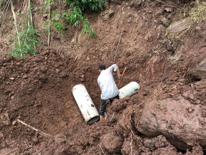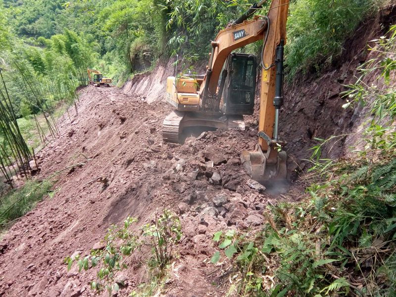 岩石计划炸药爆破,后改为挖机破碎。因为岩高钻炮眼危险,更主要是钻炮眼需要水,难度很大。