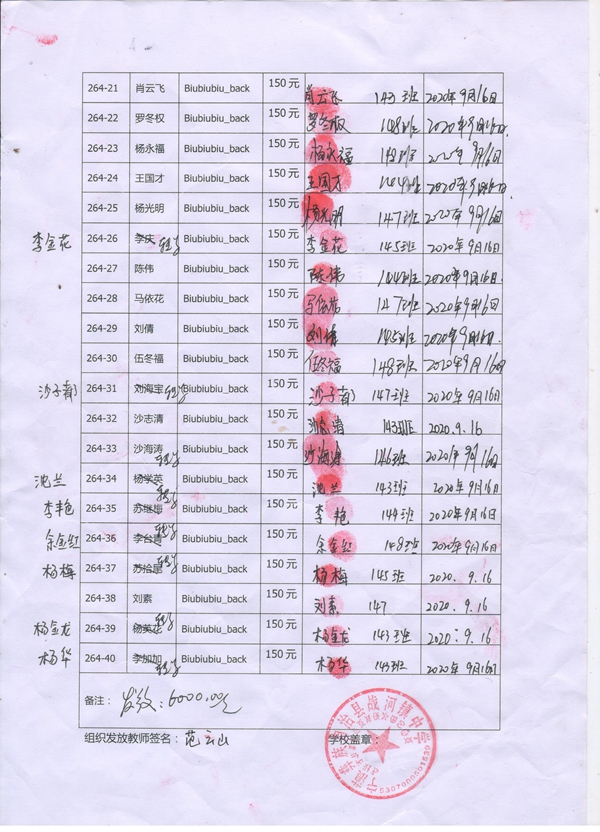 264-26李庆,因中途转学,资助款转给李金花;
