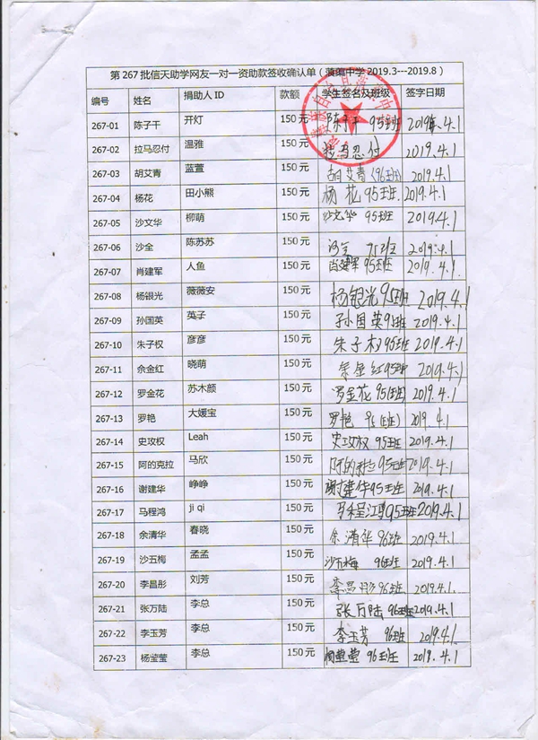 第267批蒗渠中学(2019年3月-2019年7月)受助学生签字确认单