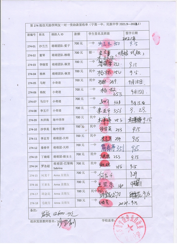 第274批高中续捐(2021年9月-2022年2月)受助学生签收单