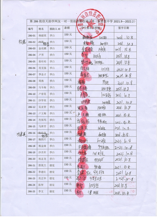 第286批新营盘中学(2021年3月到2021年8月)受助学生签收单