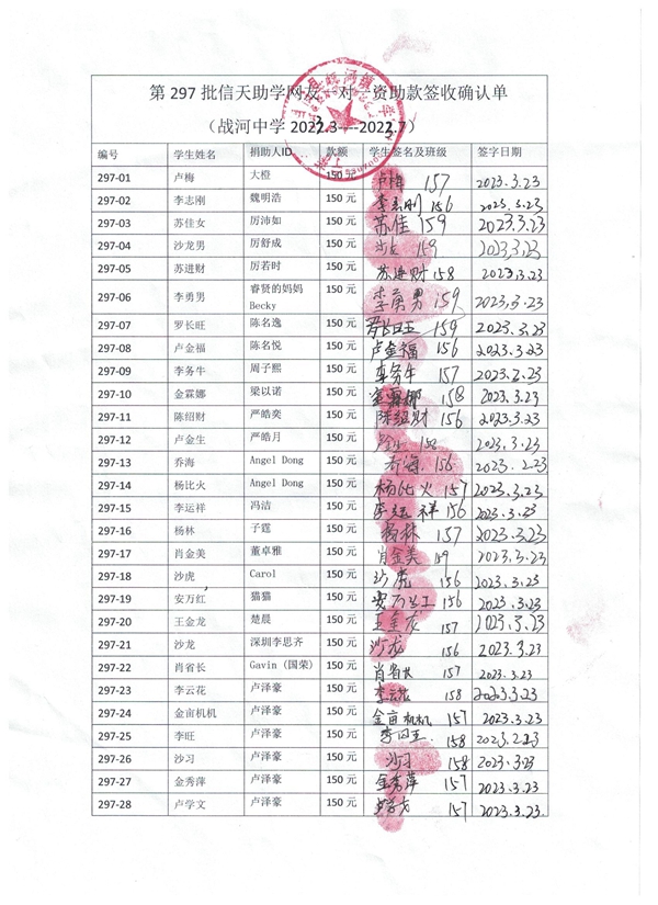 297-44杨梦洁,因中途转学,资助款转给沈芳芳;