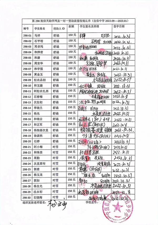 第298批拉伯中学(2022年9月-2023年2月)受助学生签收单