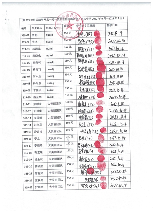第319批翠玉中学(2022年9月-2023年2月)受助学生签字确认单