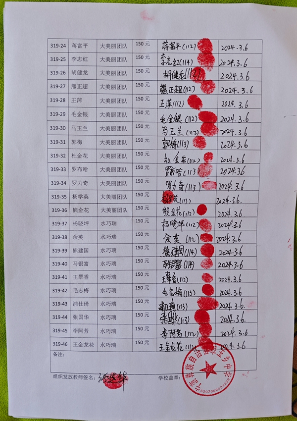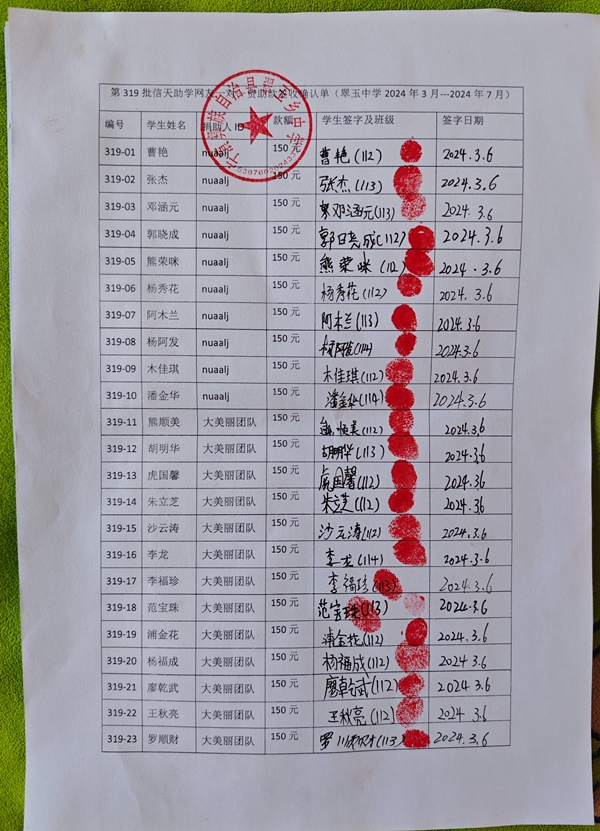 第319批翠玉中学(2024年3月-2024年7月)受助学生签收单