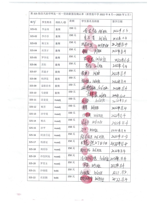 第325批新营盘中学(2022年9月到2023年2月)受助学生签收单