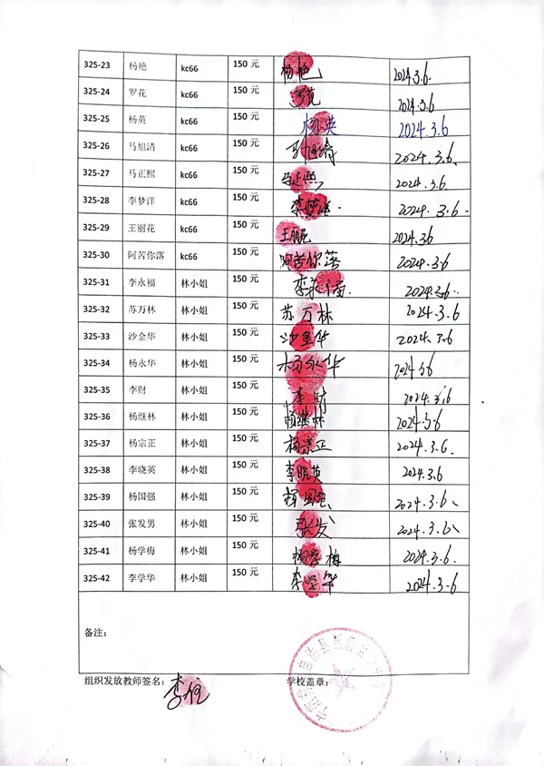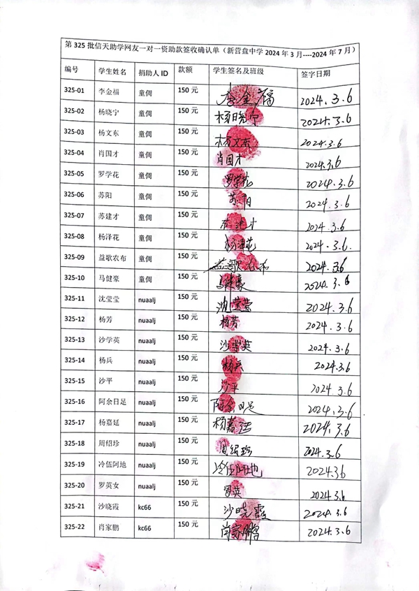 第325批新营盘中学(2024年3月到2024年7月)受助学生签收单