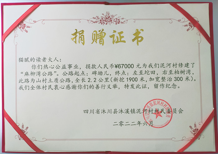 捐赠证书。