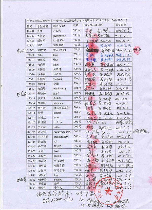 宁蒗民中125批(2014年3月-2014年7月)受助学生签字确认单