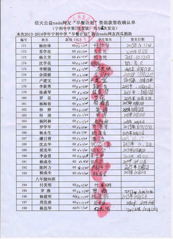 宁利中学,2013-2014年早餐计划第一次发款签收单