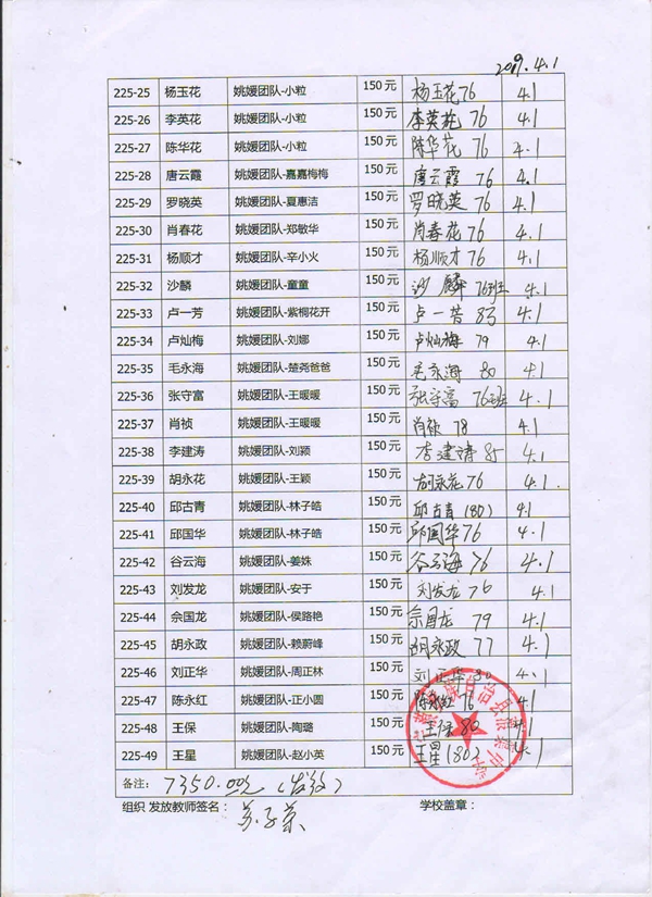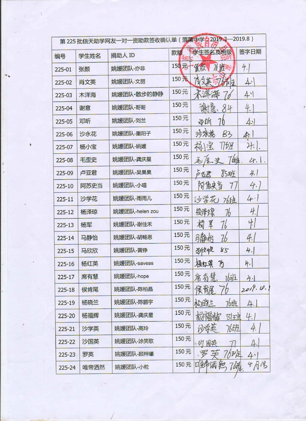 第225批蒗渠中学(2019年3月-2019年7月)受助学生签字确认单