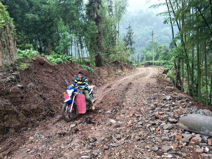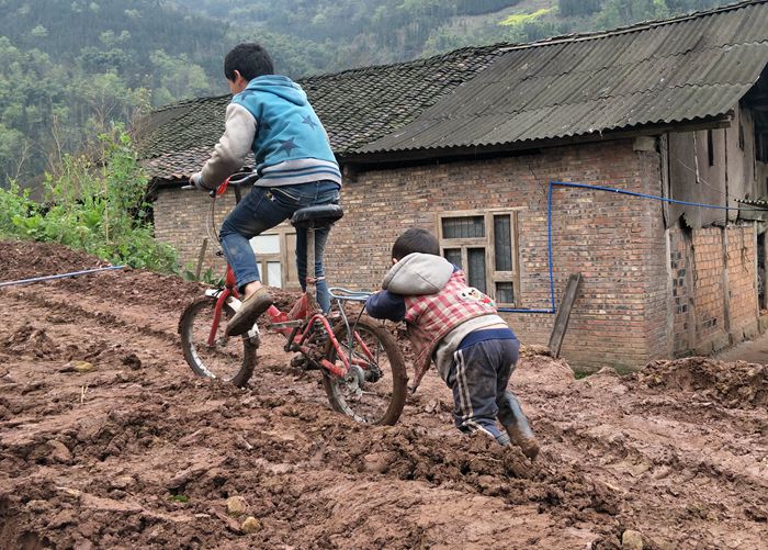 刚刚有了土路,孩子们兴奋地练习骑车。。