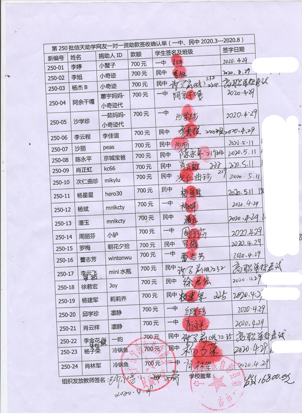 第250批续捐--宁蒗民中,宁蒗一中(2020年3月-2020年8月)受助学生签字确认单: