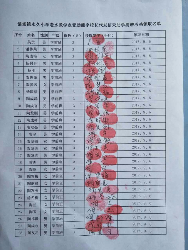 猫场镇永久小学老水教学点发放名单: