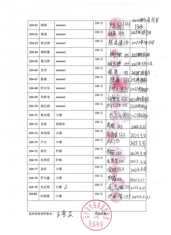 第304批宁蒗民族中学初中部(2023年3月-2023年8月)受助学生签字确认单