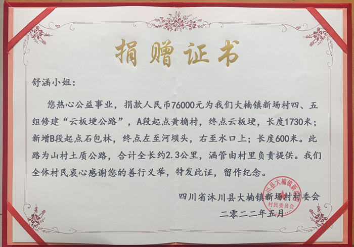 捐赠证书。