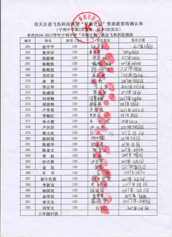 宁利中学,2016-2017年早餐计划第二次发款签收单