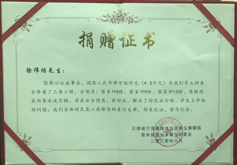 捐赠证书-徐伟鸿先生捐赠。