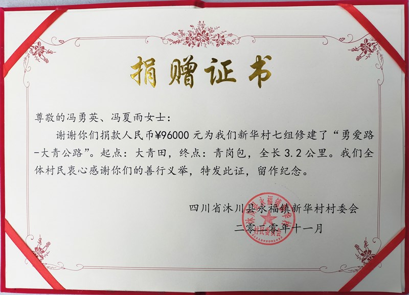 捐赠证书。
