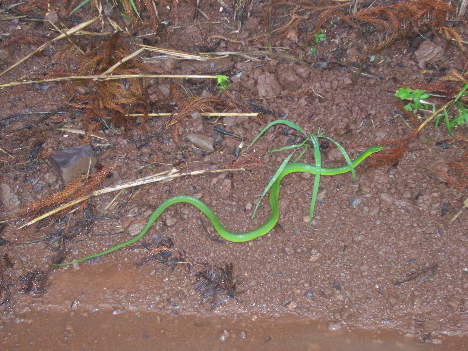 一条颜色鲜艳的青蛇不但不躲人,还主动向我冲过来,我用雨伞挡住了它,它才掉头向山坡上爬去(这里的人们看了照片,告诉我说:这是这里毒性最大的蛇了)……