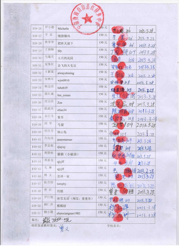 红桥中学149批(2013年3月到2013年7月)受助学生签收单: