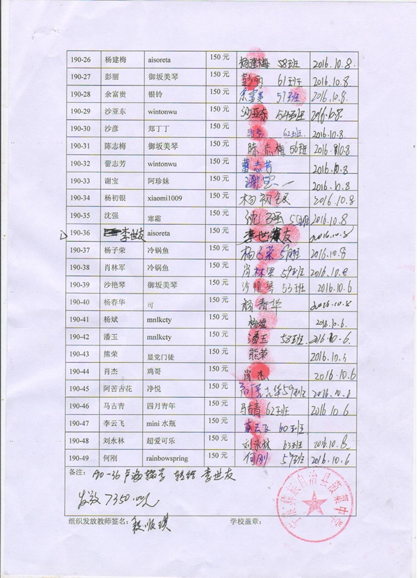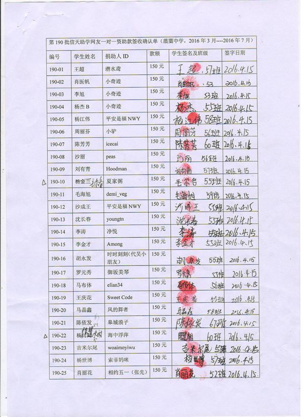 第190批蒗渠中学(2016年3月-2016年7月)受助学生签字确认单
