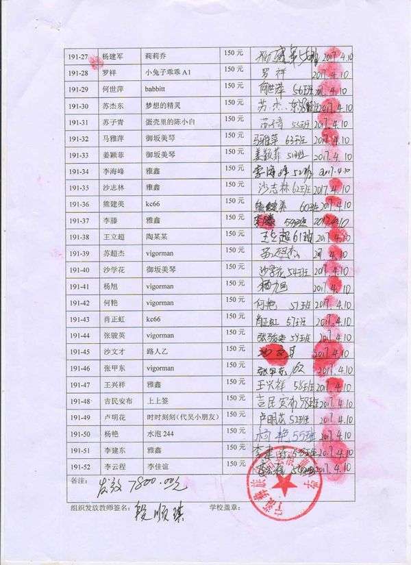 第191批蒗渠中学(2017年3月-2017年8月)受助学生签字确认单