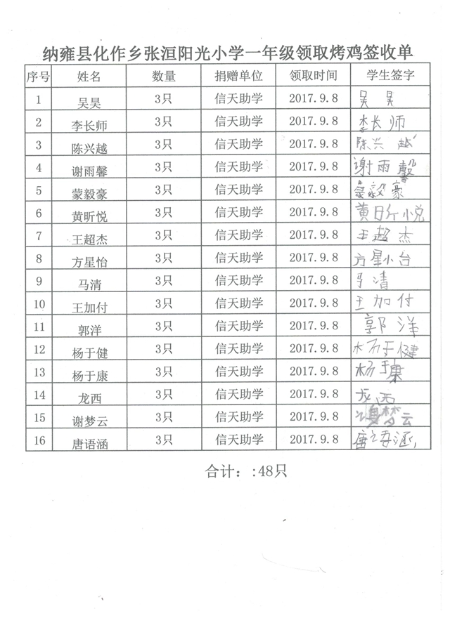阳光小学签收单: