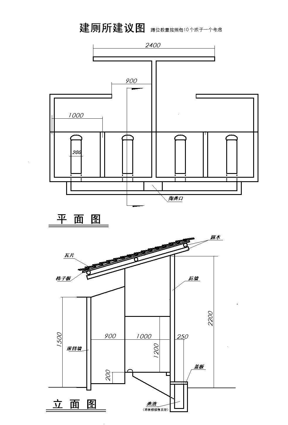规格:男女各2个蹲位, 蹲坑深1米,四壁长度15.4米,共15.4平方米,