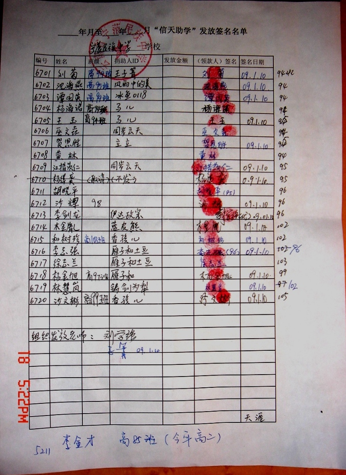6、全部捐助款到漫步轻灵账上后,她会按学期分两次汇给我们当地的委托人浦理智老师。浦老师安排再分发给受助学生,一一签字确认。知识改变命运,愿这些学生将来不再重复父辈们那艰辛苦难的日子。