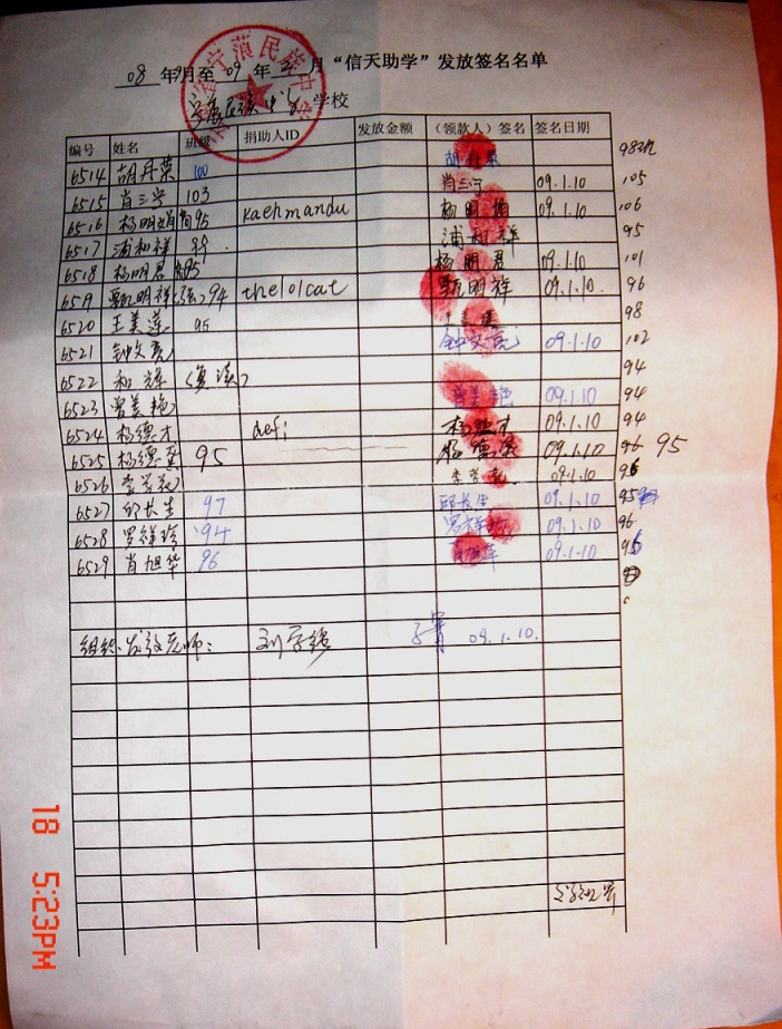 6、全部捐助款到漫步轻灵账上后,她会按学期分两次汇给我们当地的委托人浦理智老师。浦老师安排再分发给受助学生,一一签字确认。知识改变命运,愿这些学生将来不再重复父辈们那艰辛苦难的日子。