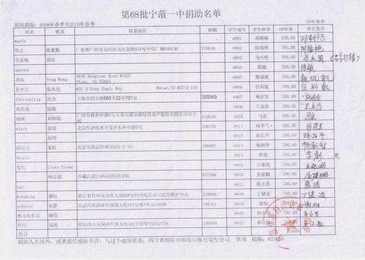 第68批宁蒗第一中学高中受助生认捐贴(本帖只做资料备份)