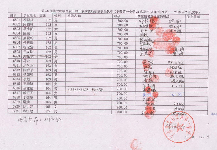 6、全部捐助款到漫步轻灵账上后,她会按学期分两次汇给我们当地的委托人浦理智老师。浦老师安排再分发给受助学生,一一签字确认。知识改变命运,愿这些学生将来不再重复父辈们那艰辛苦难的日子。