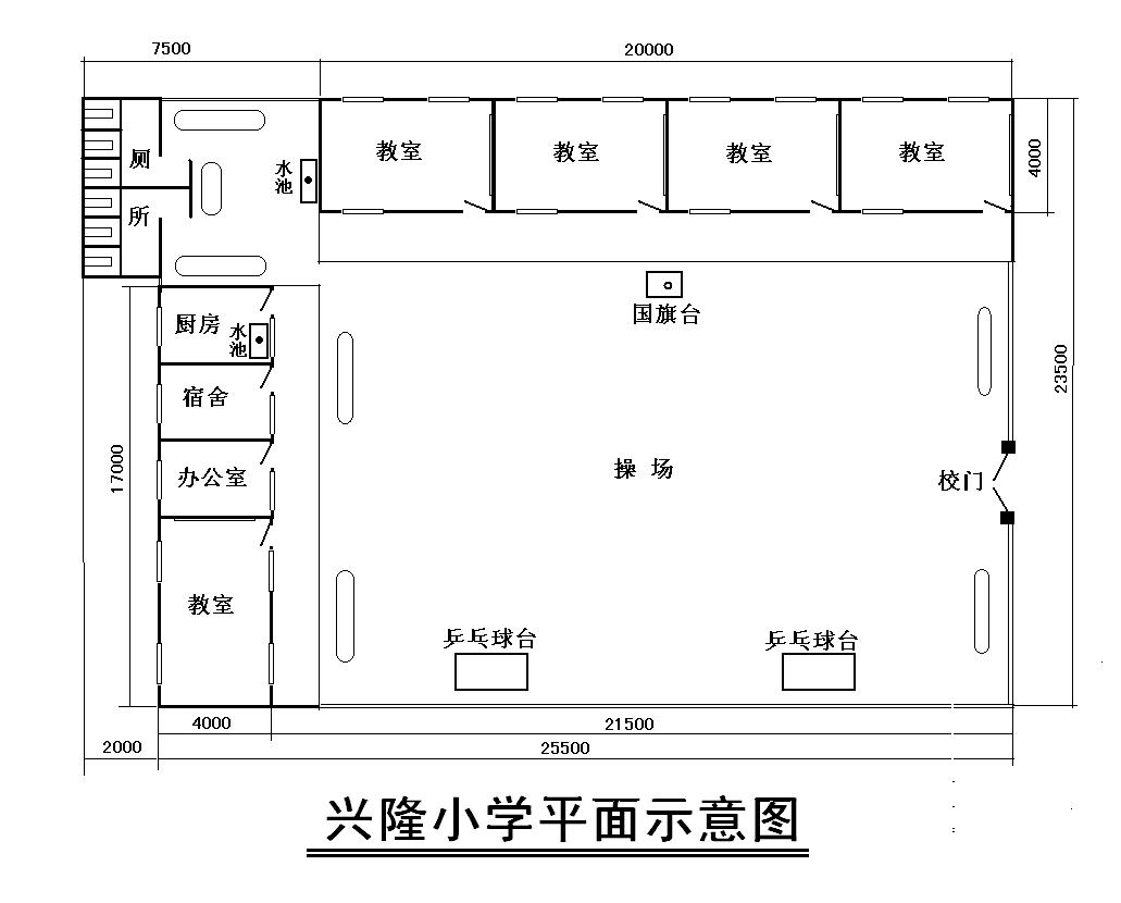 1.教室5间(4间 4米×5米+1间4×7米 ),办公及生活用房3间(3.3米×4米)