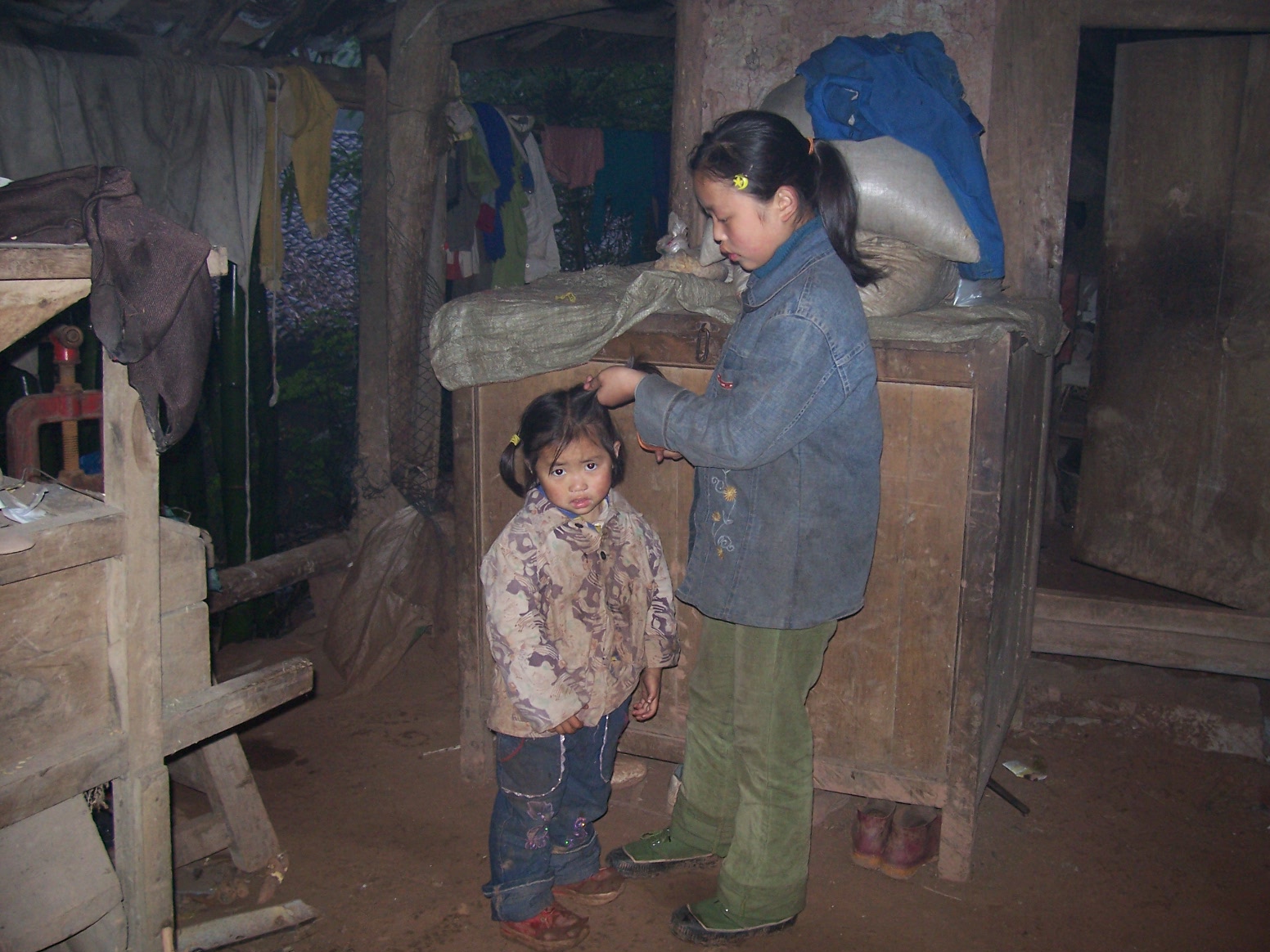昨天我们早上6点多就去她家了,她已经在做饭,爷爷头天带哥哥去县城看病了(哥哥同伙伴玩耍时被撞了胸,有些痛,去检查一下),没有在家。小兰的早晨是很繁忙的,要做饭、喂猪、照顾弟弟妹妹起床、吃饭,给两个妹妹梳头、洗脸,收拾碗筷……大多照片是早上拍的,我感觉这个孩子做事情很有条理,事情虽然多,但有条不紊的一件件做,看不到慌乱……