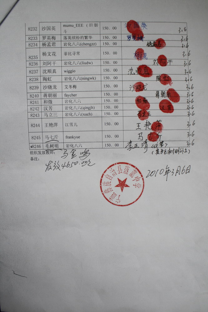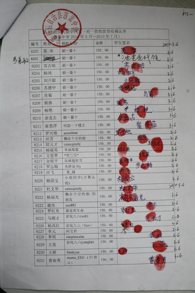 7、全部捐助款到漫步轻灵这里后,她会按学期分次汇给浦理智老师,浦理智老师和学校的负责老师再分发给受助学生(学生每学期收到150元),一一签字确认。知识改变命运,愿这些学生将来不再重复父辈们那艰辛苦难的日子。