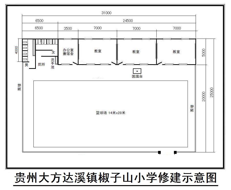 1、主体建筑——含3间教室和一间教师用房 教室 5米x7米x3间 教师用房 5米x3.5米x1间