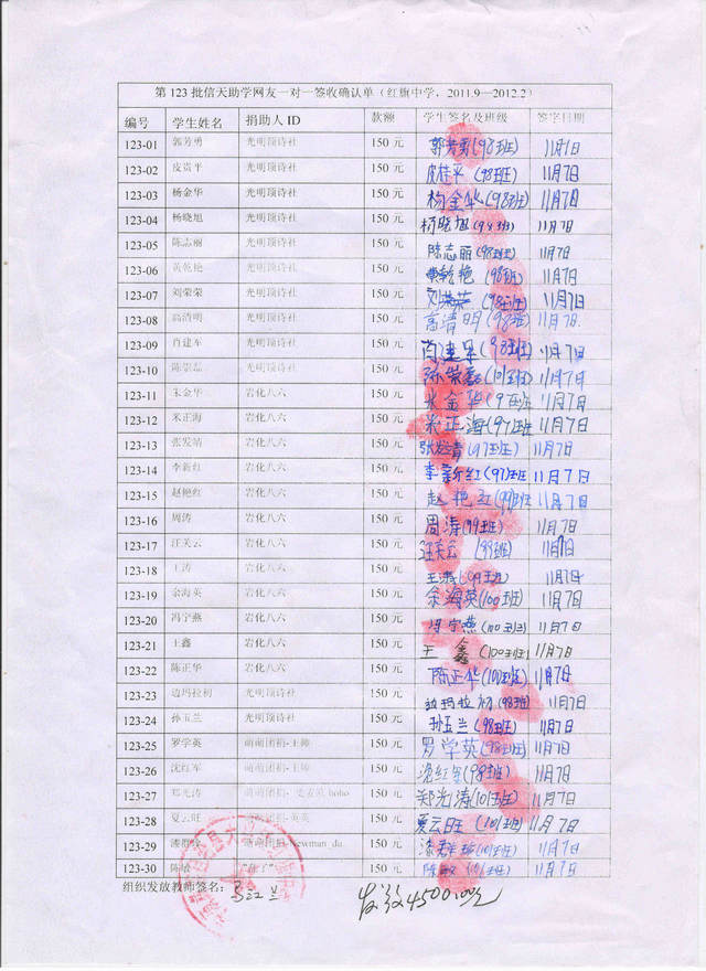 我们将收取全部六个学期的资助款,每学期初汇给委托老师浦理智老师,由浦理智老师按学期组织向受助学生发放资助费,最后我们统一在网上公布受助生领款签收单。