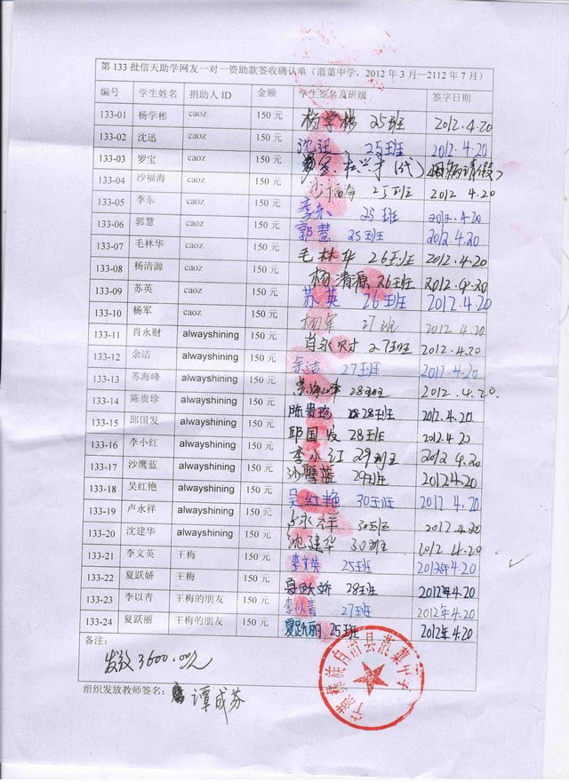 初一年级学生,编号133-01----133-24:资助款为750元/人,2012年3月---2014年7月,共5个学期,一个学期150元。