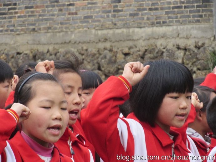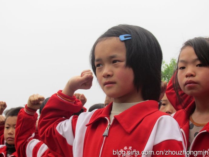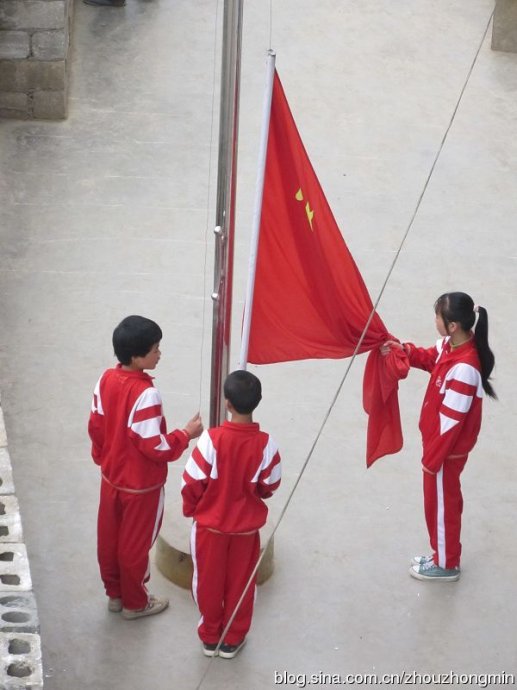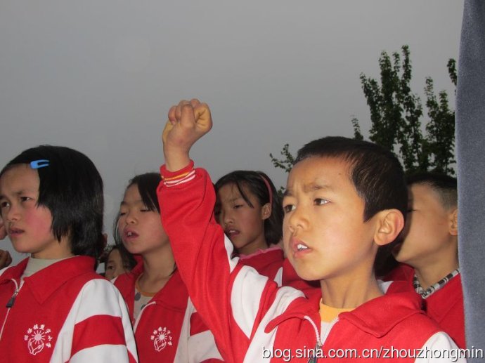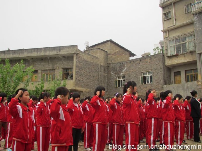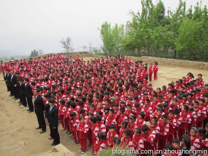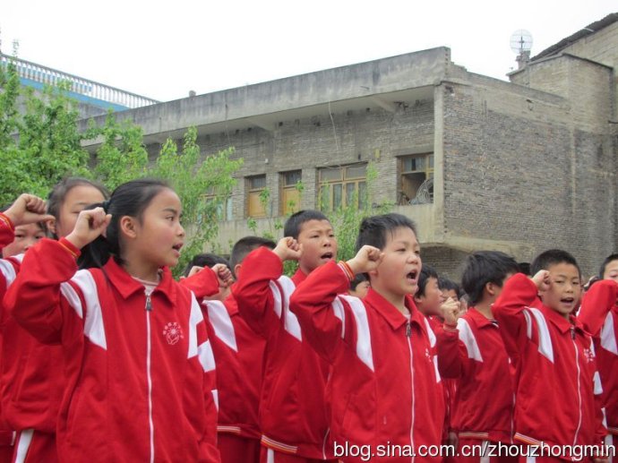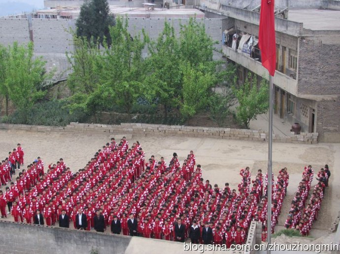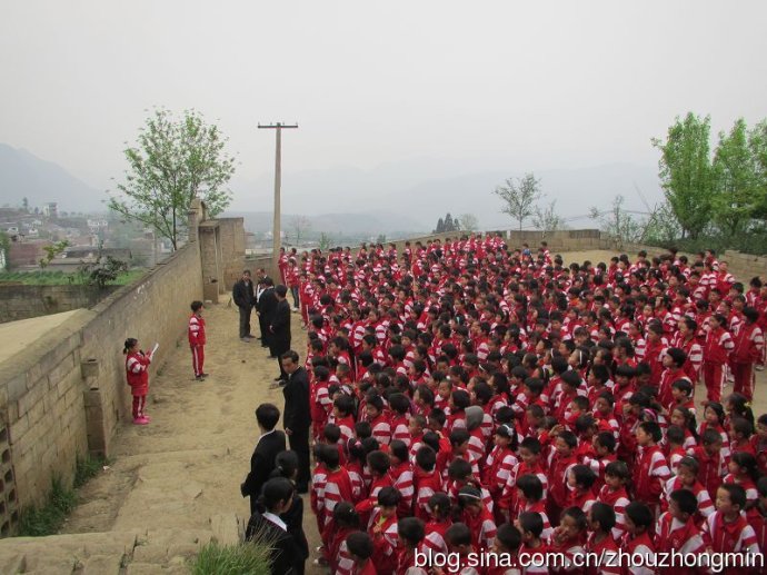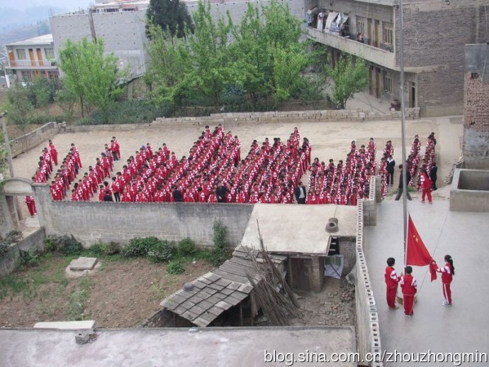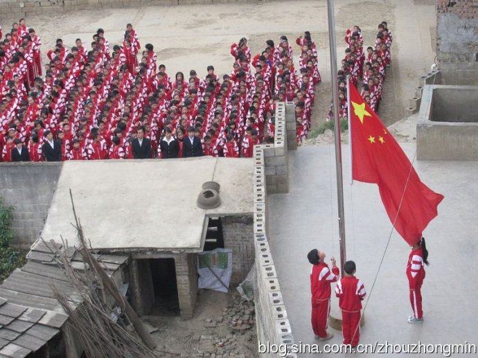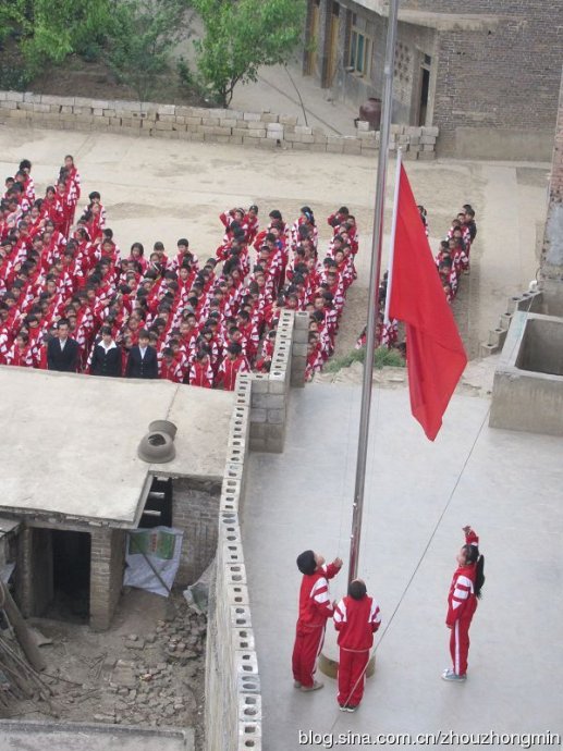 窘迫的操场(每人还不足一平米),简陋的升旗仪式(学生刚刚得到北大校友捐助的校服)