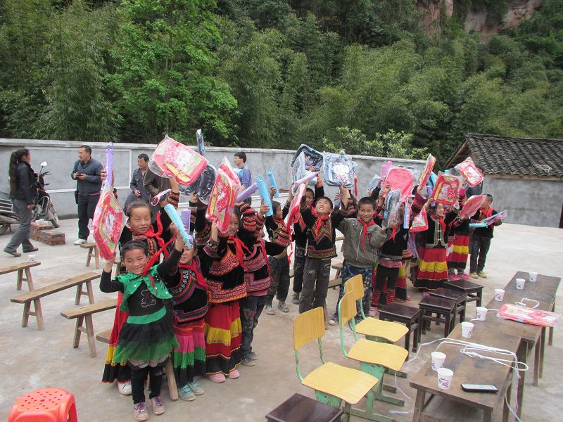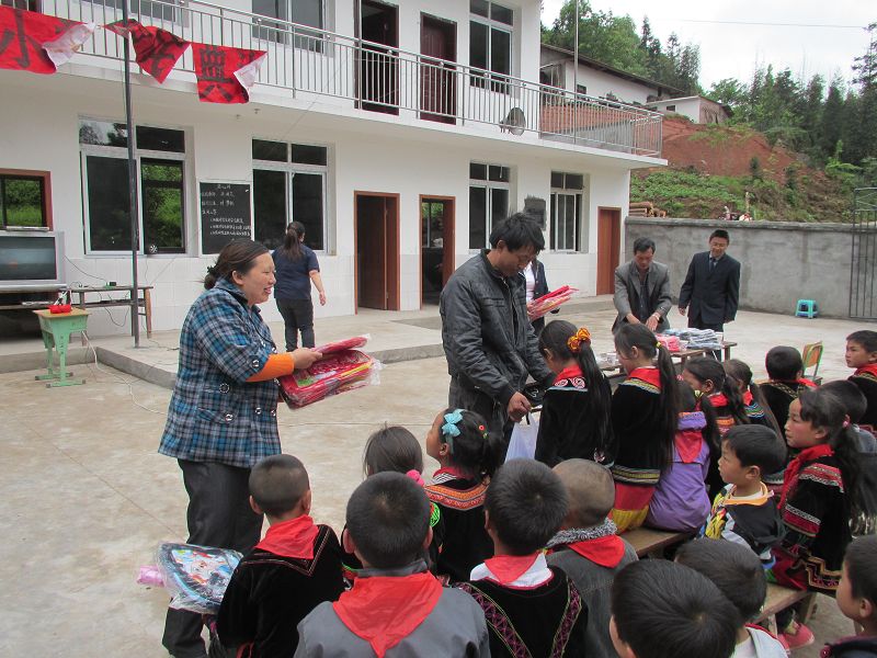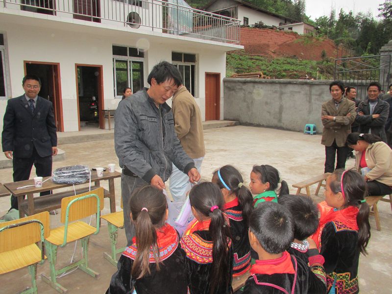 施工组织者王建华(他只是一个做了多年建筑的农民,本身并不富裕,自家住的还是在村里的破旧瓦房)捐给这里每个孩子一套校服、一个书包、一把雨伞