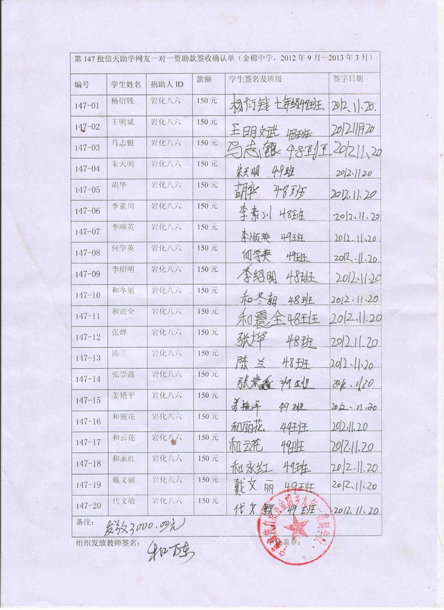 初一年级学生,编号147-01----147-20:资助款为900元/人,2012年9月----2015年7月,共六个学期,一个学期150元。